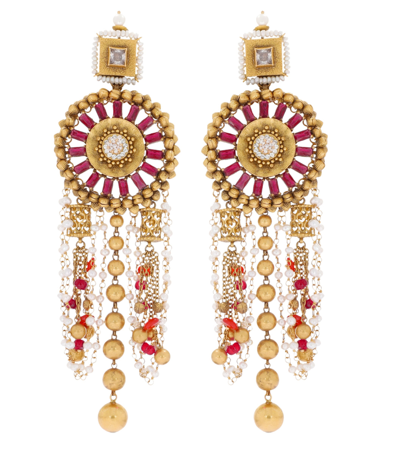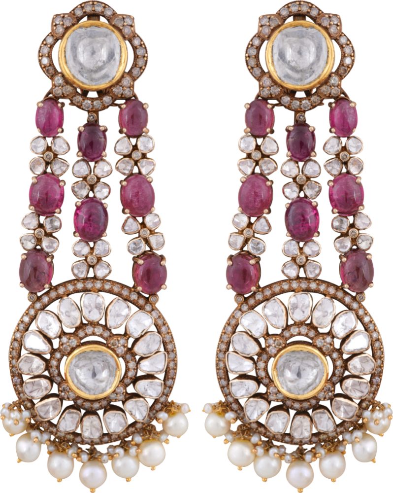 Gold danglers featuring structured floral polki and pearl patterns linked with ruby and polki strings. By RAMBHAJO’SThe open-work chand balis are rendered with rubies, polkis and aquamarine beads. By ACHAL JEWELS