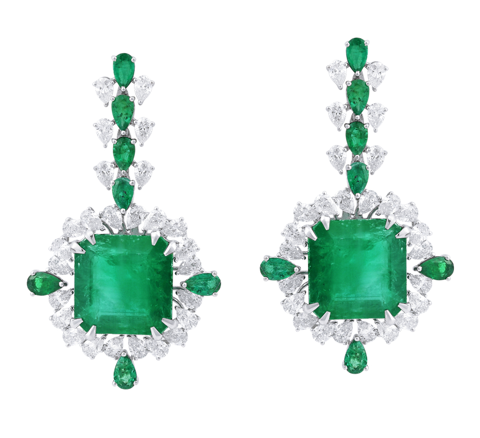 Emerald and diamond structured linear drop earrings. By SAVIO JEWELLERY