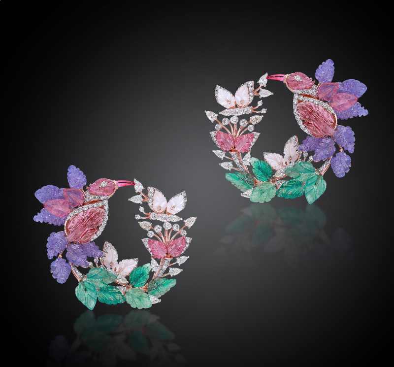 Quirky earrings depicting birds pecking at the gem-set buds and leaves from the Songs of Nature collection. By SANSKRITI JEWELS