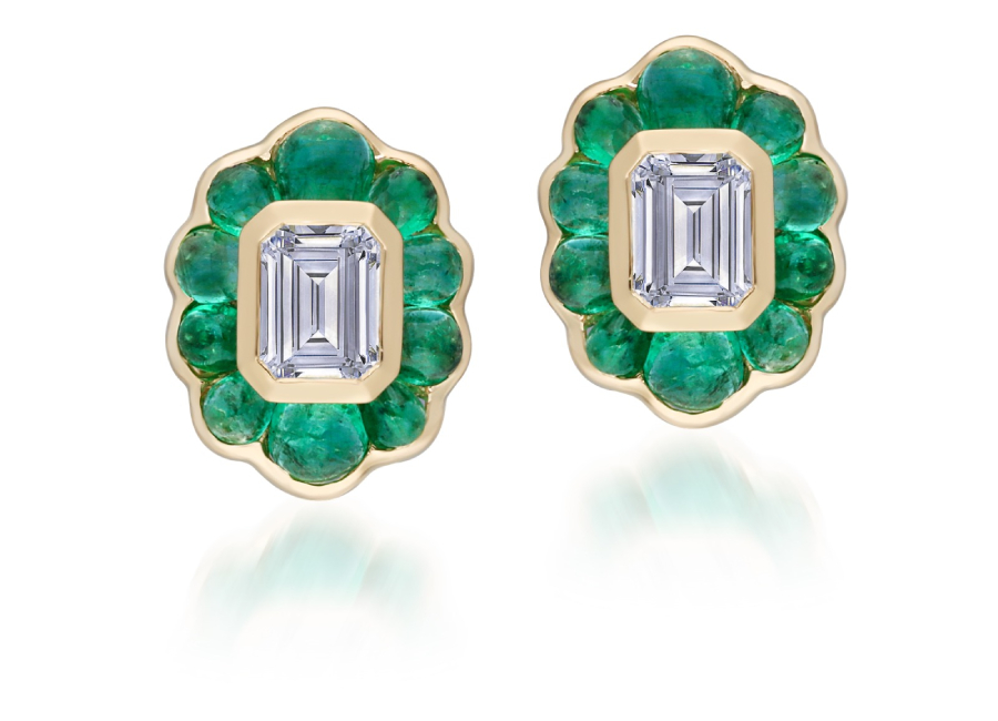 Ear studs featuring radiant-cut diamonds framed with emerald petals set in gold. By (MOKSH FINE UNSEEN JEWELS (TANVIRKUMAR & CO.)