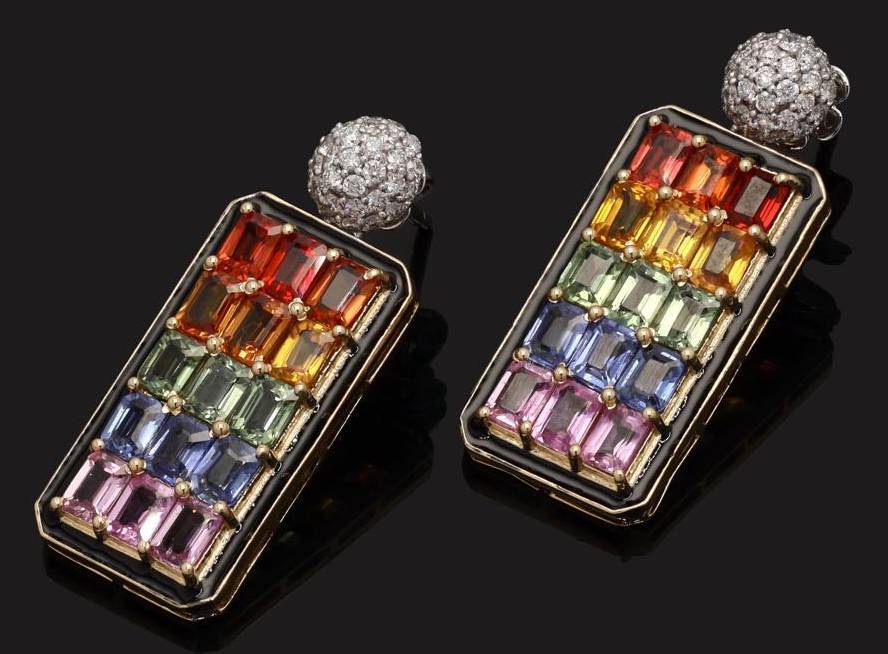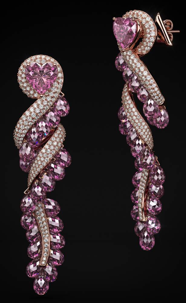 Drop-shaped earrings patterned with pink sapphires and fancy-cut diamonds. By Anand Ranawat