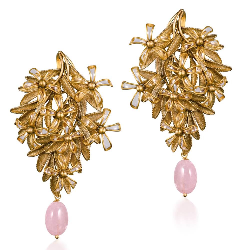 The 22-karat gold earrings feature a cluster of tiny textured florets suspending baby pink gemstones. By Anand Shah