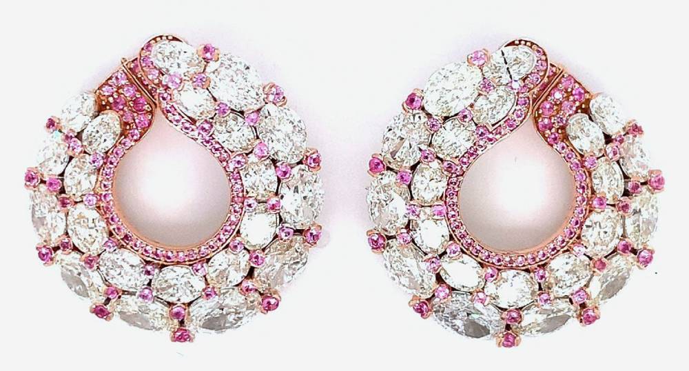 Pirouette three-row oval white diamond creole hoop earrings crafted with pink sapphires and oval diamonds set in 18-karat white and rose gold. By Rashesh Shah by D’unique Jewels