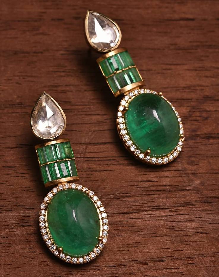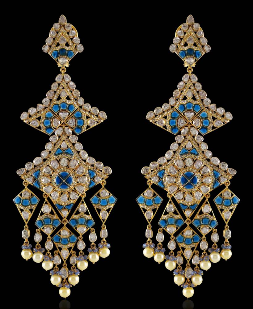 Geometric tiered chandeliers decorated with polkis, pearls, diamonds, and hints of blue enamel. By Kalajee JewelleryA play of patterns makes these fuss-free earrings stand out. The polki posts suspend two rows of baguette emeralds, culminating into oval shaped cabochon emeralds lined with diamonds. By Haritsons Designs Pvt. Ltd.