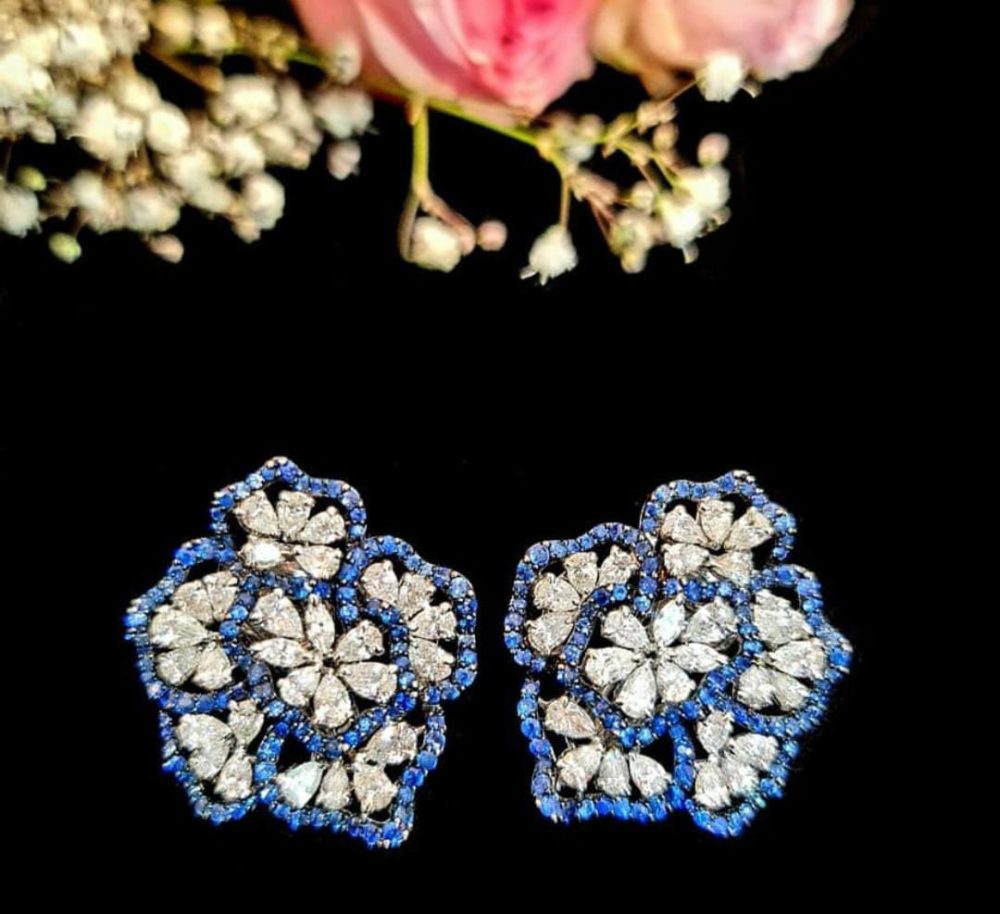 Organic floral ear studs set with drop-shaped diamonds and bordered with blue gemstones. By Raveeta Batra, Sai Regalia Jewellery
