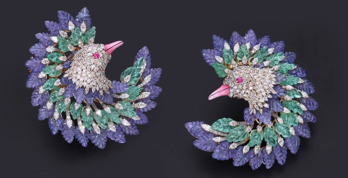 The songbird C-clips are adorned with carved tanzanite and Columbian emerald leaves. The head is encrusted with diamonds, while the beak gets an ombre pink enamel shading. By Sanskriti Jewels