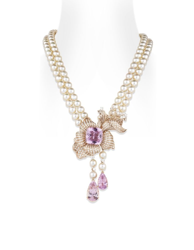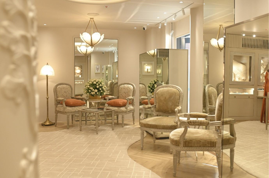 The interiors balance old-world romance with contemporary refinement. A palette of soft champagne, ivory, and warm sand is layered with silken lacquered furniture, sculptural accents, and carefully modulated lighting, creating an environment in which the jewellery remains the true focal point.