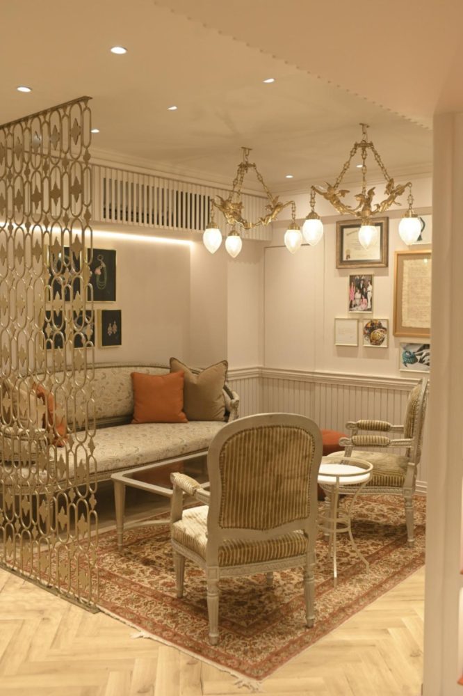 A private lounge with the brand’s monogram Aayat-inspired brass mesh, sculptural furnishings, and layered lighting invites moments of reflection and slow luxury, while a Wall of Memories honours Farah’s design journey and her mother’s lasting influence.