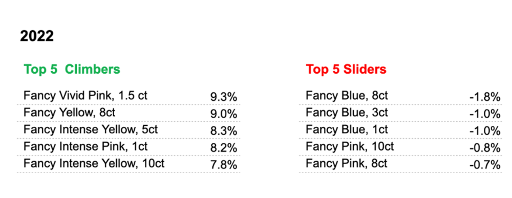 In Q4 2022, Pinks of all sizes appreciated by 0.8%. The 1.5-carat Pinks in the Vivid grade increased by 4.6% and were the main contributor to the overall increase. During 2022, weight categories below 8 carats presented significantly better results (with an average climb of 5.5%) than higher weight categories. The Vivid 1.5-carat grade was the highest climber among all fancy diamonds in 2022, with an increase of 9.3%.