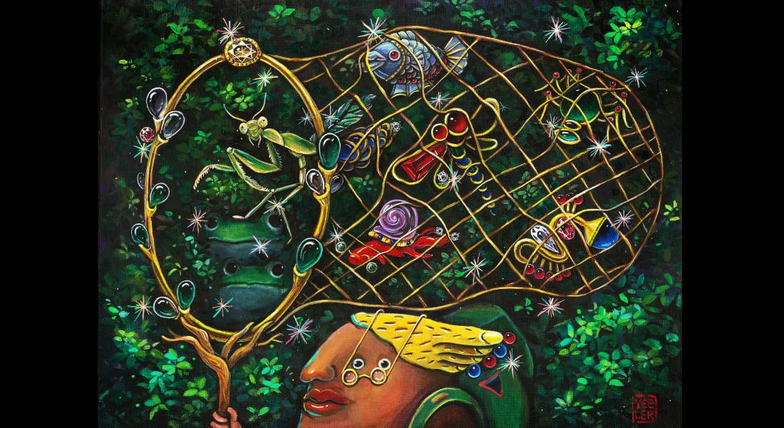 An artwork by Taiwanese artist YEELER titled ‘The Jewellery Magician’. The painting shows a novice jewellery magician wandering through the woods, catching its residents, and through his magical powers turning them into jewels. The painting was showcased as part of the Flair Project at the recent GemGenève show, which was curated by jewellery influencer Katerina Perez.