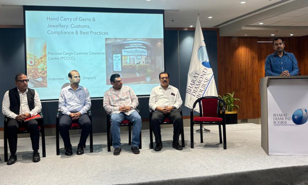 GJEPC, in association with Bharat Diamond Bourse (BDB) and Mumbai Customs, conducted a focused session on Hand-Carried Jewellery Exports from Mumbai Airport at BDB on 17 February. The session provided practical guidance on procedures for carrying high-value jewellery consignments, documentation requirements, and compliance protocols. It also included a briefing on key Budget 2026-27 provisions for the gem and jewellery sector. The event was graced by Shri Ashish Borda, Convener – PMBD, GJEPC, who welcomed the guest speakers.