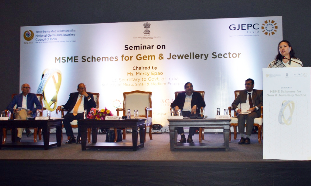 A seminar on various schemes for Micro, Small and Medium Enterprises (MSMEs) in the gems and jewellery sector was held in Jaipur on 18th November 2023. The seminar was organised jointly by the Gem and Jewellery Export Promotion Council (GJEPC) and the National Gems and Jewellery Council of India (NGJCI), and was chaired by Ms. Mercy Epao, Joint Secretary, Ministry of MSME, Government of India.