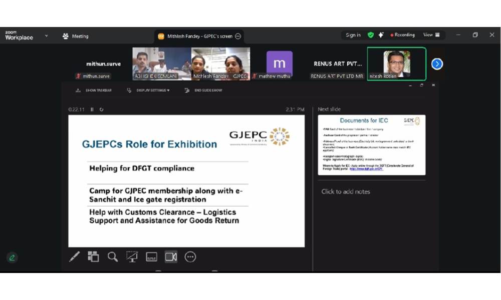 GJEPC, working with the Imitation Jewellery Manufacturers Association, held a webinar to help new entrants navigate the compliance process for international exhibitions. The Membership and Policy Team walked participants through IEC applications, ICEGATE and AD Code registrations, and the full list of documents required.
