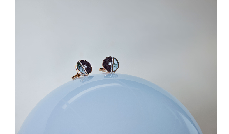 Crafted from fine leather, moss agate, gold and diamonds, the pair of reversible pair of cufflinks features a discreetly positioned SIM card chip tying up fashion and function.