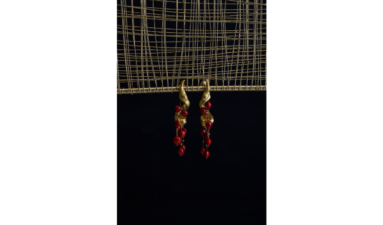 The gold danglers use the manjadi kuru, or lucky seeds (Adenanthera pavonine), capturing the essence of pure innocence and joy from childhood.