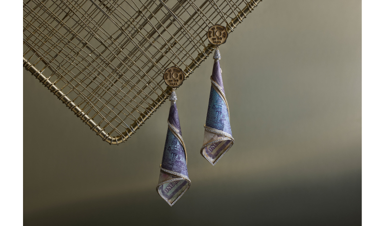 The earrings are crafted from genuine one-rupee notes, featuring 10-paise old, scalloped coins as posts encased in gold. The folded earrings are adorned with diamonds.