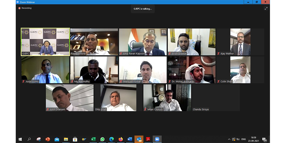 The participants discussed the current economic and business scenario, jewellery trends, trade procedures, to further strengthen ties between the two countries. The virtual meet was attended by H.E. Pavan Kapoor, Indian Ambassador to UAE; Arulanandan, Director, Ministry of Commerce & Industry; Kalimuthu, Consul Commerce; Colin Shah, Chairman GJEPC; Milan Chokshi, Convener, PM&BD, GJEPC; Mansukh Kothari, Convener, Events, GJEPC; Konal Doshi of Modern Impex; Anish Birawat of Chain & Chains; K Srinivasan, Convener, Gold Panel, GJEPC; Dilip Shah, Convener, International Exhibitions; Justin Sunny of Joyalukkas; Dr. Motaz Al Shueibi of Salem Al Shueibi Jewellery; Chandu Siroya of Siroya Jewellers; Ajay Mathur, Bullion Expert; Ramesh Vora of Bafleh Gold; Amit Dhamani of Dhamani Diamonds; and Arjun Dhanak of Kanz Jewels. The moderator for the event was Sabyasachi Ray, Executive Director, GJEPC.