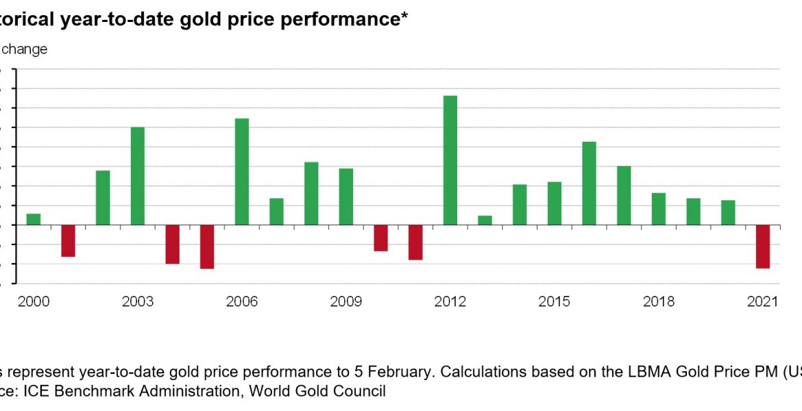 1 Year-to-date performance to 5 February, calculated using the LBMA Gold Price PM (USD).