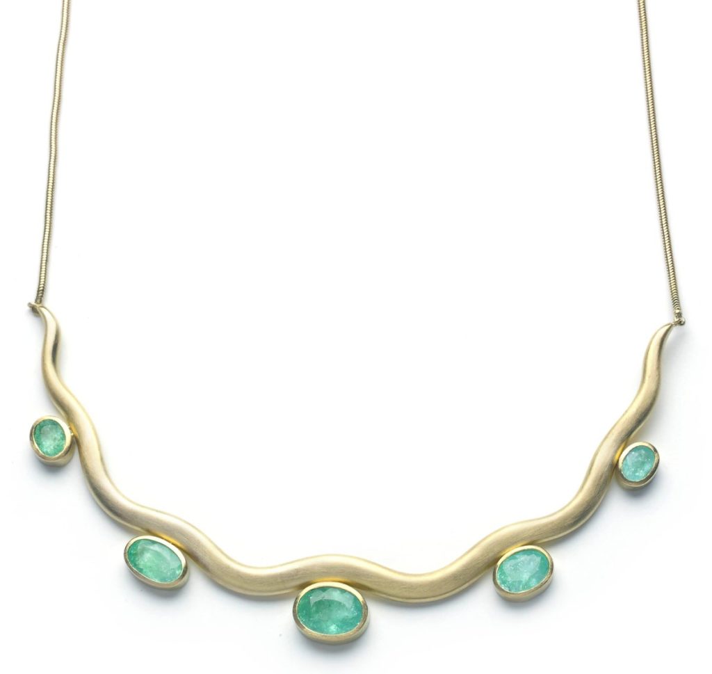 Julia’s work focuses on the intersection of colour, form and texture. She sources unusual gemstones of exceptional colour. Her innate feel for metal, proportion and finish, combined with her eye for colour, enable her to instinctively present these stones to their best potential. Her Paraiba tourmalines tend to be set in beaten yellow gold, evocative of sea and sand.