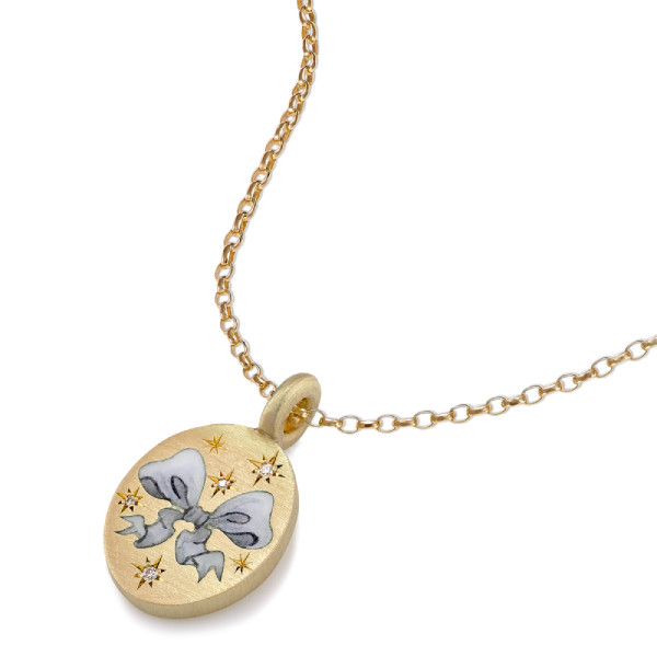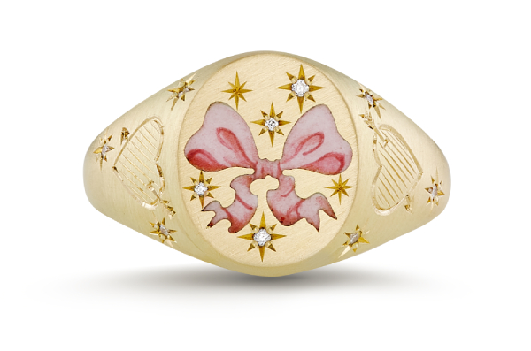 “Inspired by the erotic frivolity, over-the-top romance and ornamental beauty of the Rococo period, these traditional signet rings and pendants have been given a modern Cece twist,” she explains. Cece has also matched up each engraving to the colour of the ribbon on the pieces. The colourful accents are rendered using hand-painted champlevé enamel.