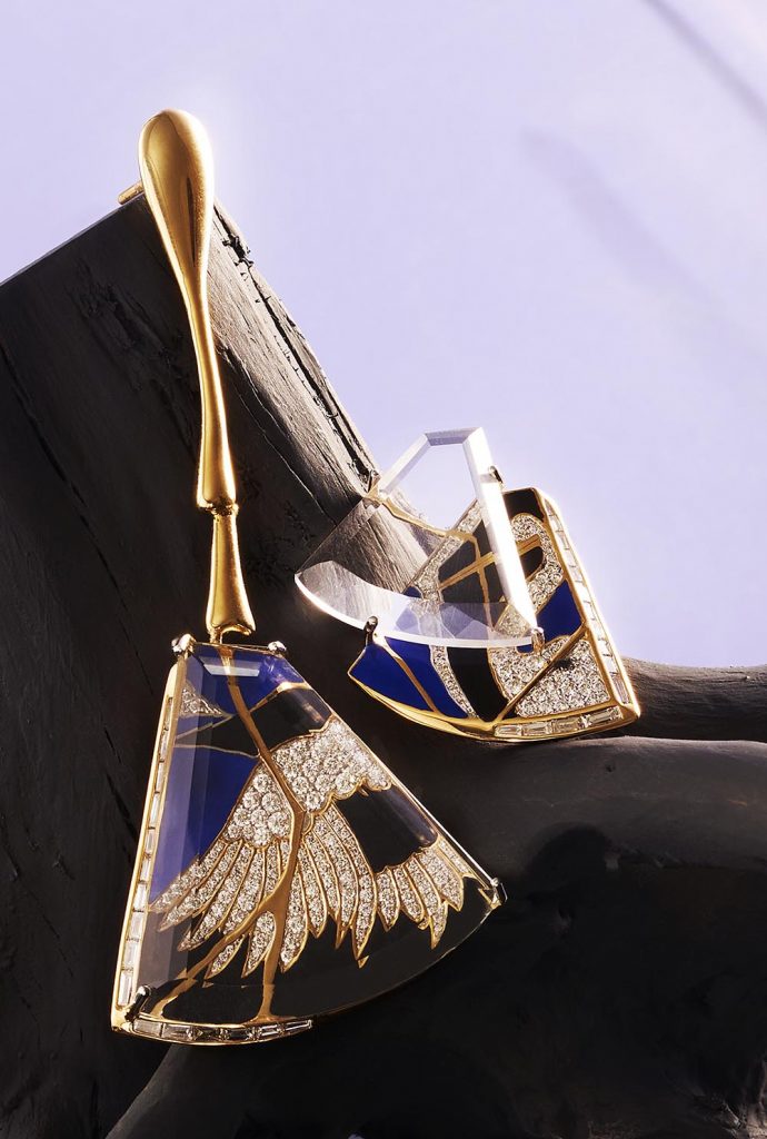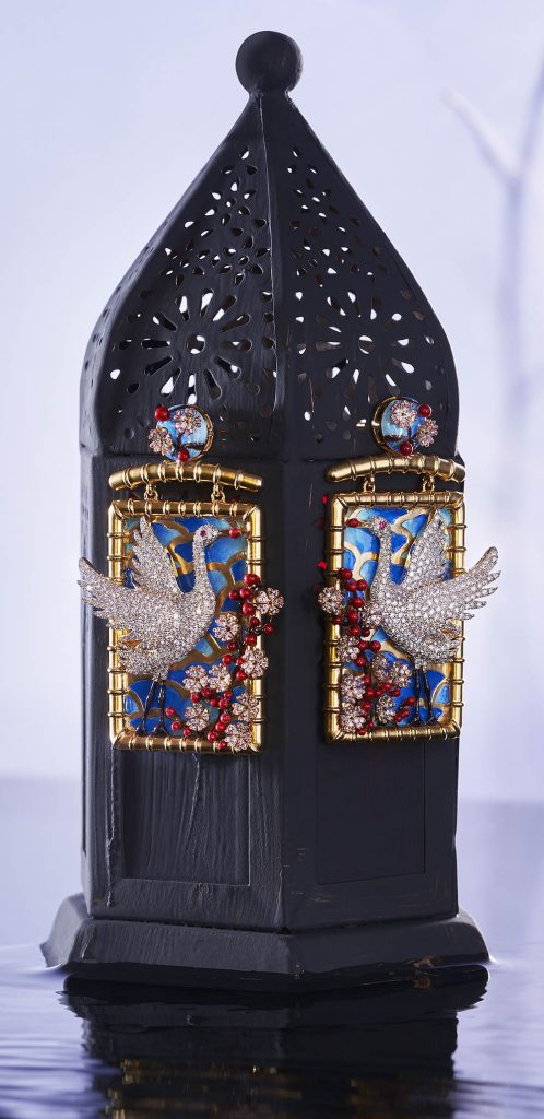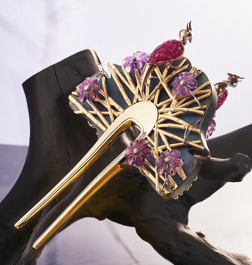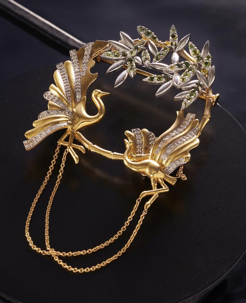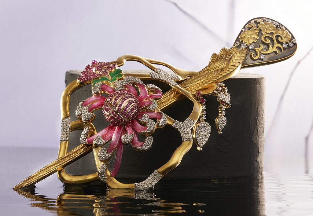 These atypical modern bejewelled creations highlight some of the archetypal Japanese motifs replete with sleek and spiral bamboo, glossy cherry blossoms, magnolia, wisteria, beautiful birds, fine foliage and more.