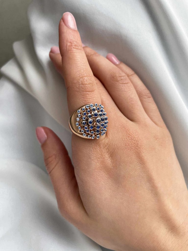 At Nigel O’Reilly, there were some real showstopping designs. This was the Irish brand’s first ever show in London, and I know many of our visitors were delighted to see the pieces in real life after following them online for many years. The Nigel O’Reilly jewel that was most talked about at the show was the Opal Hemisphere ring, which set a dazzling black opal within a cage of gold and sapphires.