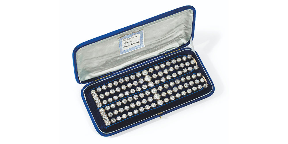 The auction was led by the historic diamonds owned by Marie-Antoinette, the last Queen of France, which passed through the family by descent for the next 250 years. The jewels, made by Boehmer in 1776, attracted bidding from the room and telephones and achieved $8,203,085, setting the second highest price for a jewel owned by Marie-Antoinette and the highest price for a diamond jewel ever sold with the storied Marie-Antoinette provenance.