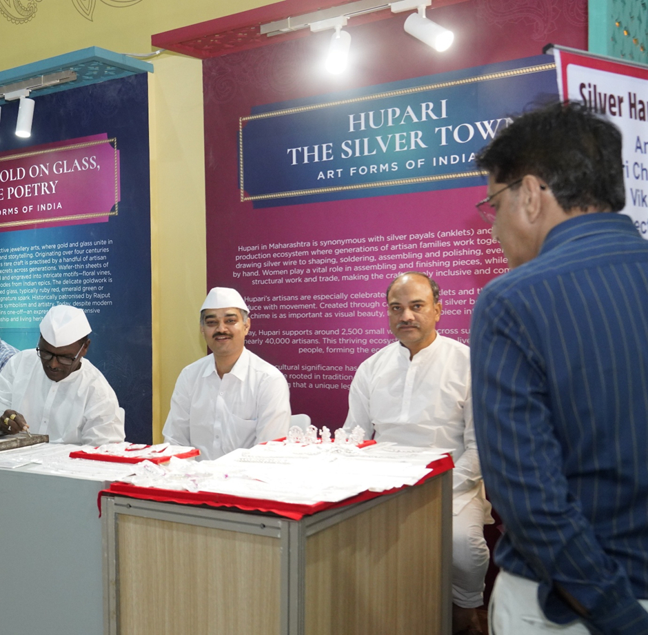 At the IIJS Bharat Signature theme, the Crafts Pavilion in BEC focused on the country’s masterful craft traditions and how they continue to shape modern jewellery design. In the fourth and the last of our series, we turn our spotlight to Hupari, a town in Maharashtra renowned for its silver ornaments, especially its iconic anklets. The GI tag for Hupari Silver Craft was secured by the Chandi Karkhandar Association, Hupari, representing the town’s traditional silver artisans. The process was facilitated by NABARD, Maharashtra, helping formalise recognition and protect the craft’s regional identity.