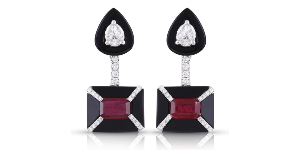 These snazzy linear danglers are designed with corals and diamonds set in black rhodium silver. By Silver Mountain