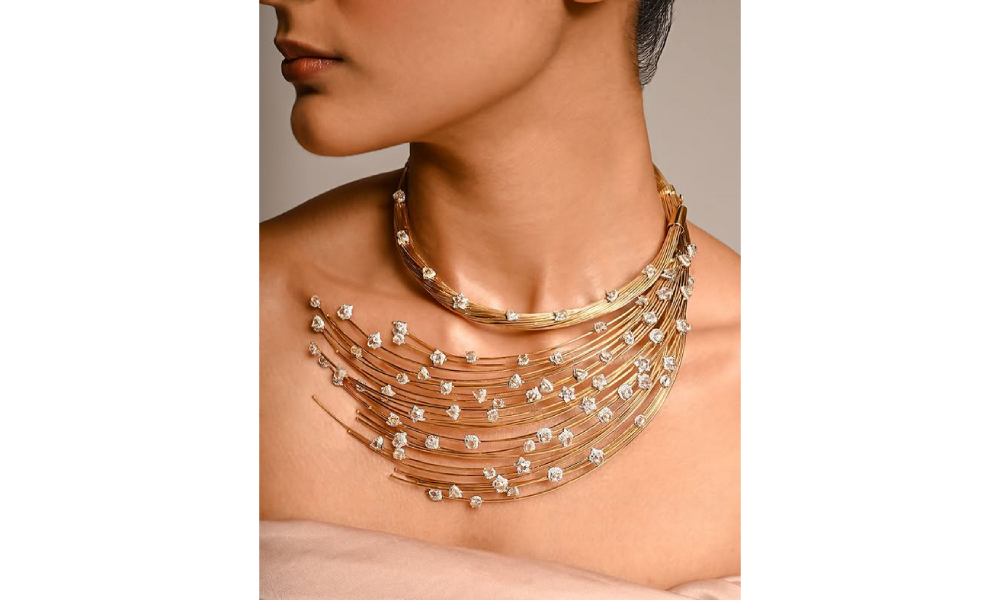 Minimalism, for her, is about character, clarity of design, not cutting corners on value. Versatility is another key theme. Several necklaces are designed to be worn in multiple ways—up to three formats. A single piece can transition from a bold, front-facing statement for festive occasions to a lighter, more understated look for everyday wear. Parts of the same necklace can even be separated and styled as a bracelet, offering flexibility without compromising aesthetics.