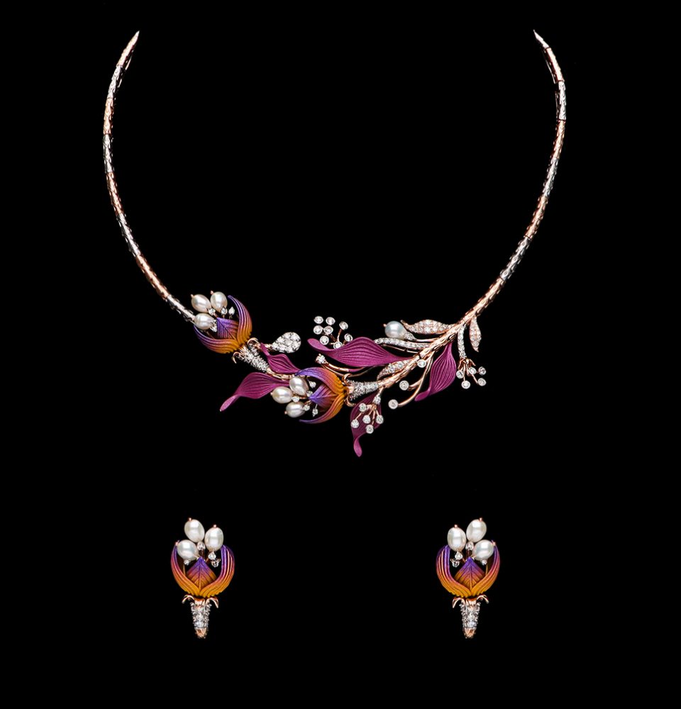 Diamonds paired with ceramic enamelling recreate the effect of light filtering through latticework. “The response has been amazing,” she says.