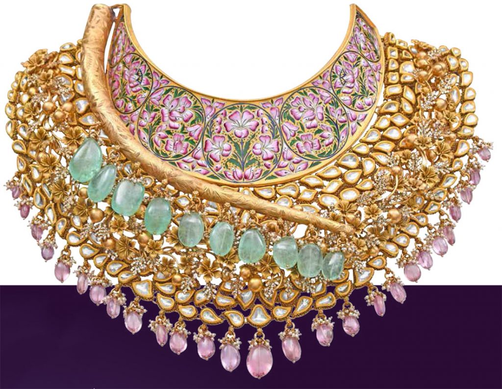 Exhibitors will be presenting innovative designs at the trade show while highlighting India’s rich legacy of intricate craftsmanship in filigree, temple jewellery, beadwork, meenakari and more. The pieces are encrusted with a smattering of diamonds, polkis and gemstones to enhance the overall appeal. Here are a few statement jewellery pieces to get the gold frenzy going.