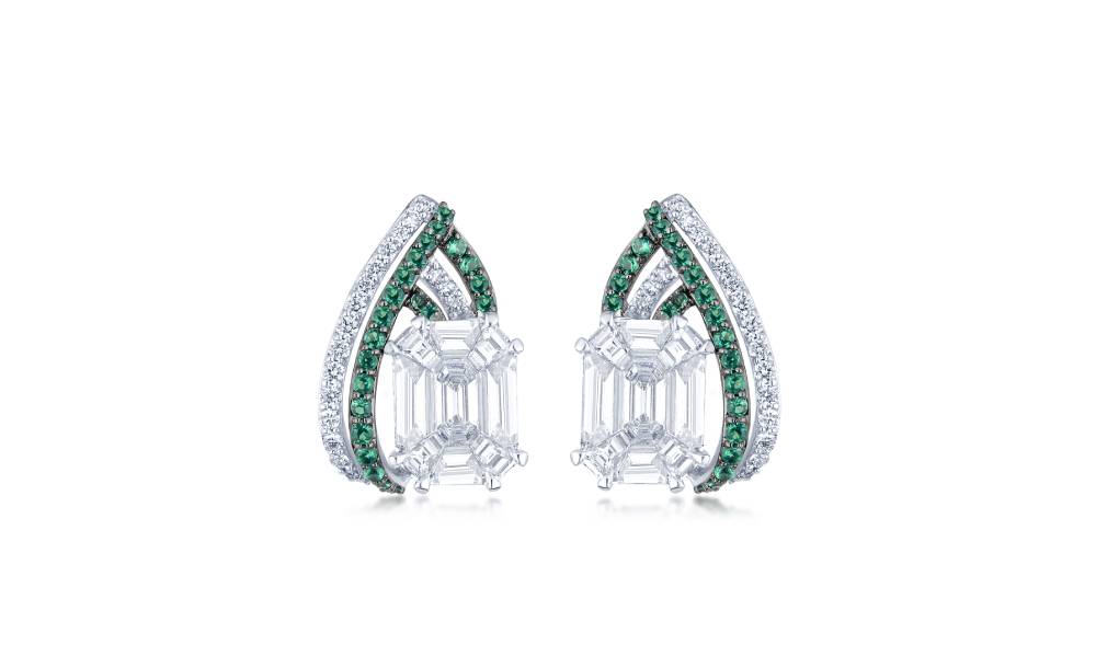 Emerald and pie-cut diamonds lend these drop-shaped ear studs a 3D look. By PARTH DIAMOND