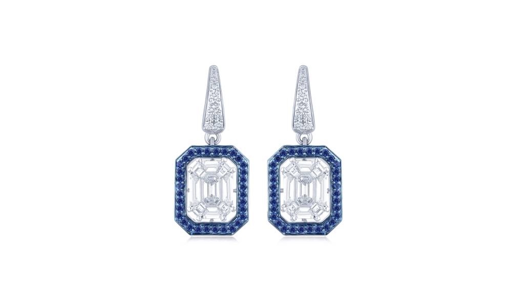 White gold earrings set with tanzanites and pie-cut diamonds creating an illusion of a dazzling 2-carat look. By PARTH DIAMOND