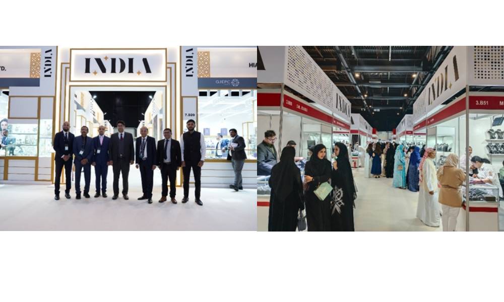 The India Pavilion showcases a diverse range of exquisite jewellery, including diamonds, coloured gemstones, and gold jewellery, crafted by top Indian jewellery exporters.