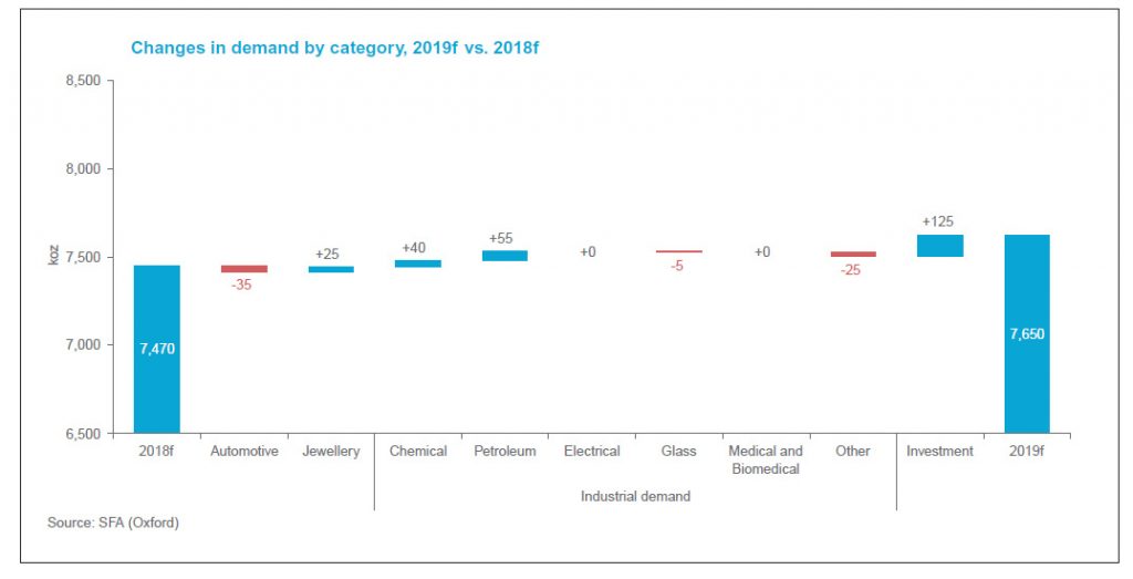 Platinum jewellery demand is estimated to grow 1% (+25 koz) to 2,430 koz in 2019, which would make it the first year of growth since 2014.