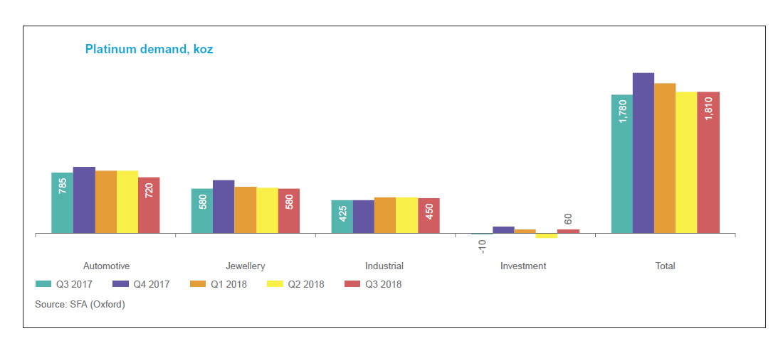 Jewellery demand for platinum in the third quarter of 2018 was 580 koz, down 10 koz from the previous quarter and flat year-on-year. A surprisingly weak quarter for China offset the year-on-year growth in other regions, which mainly came from the US and India.