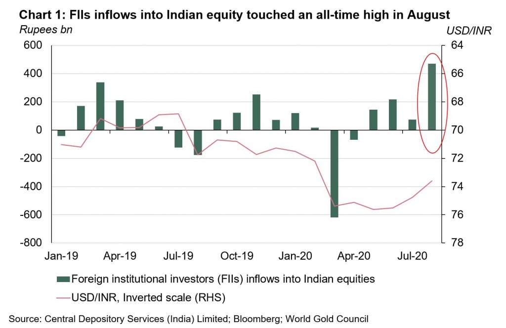 The risk-on sentiment in global equity markets – triggered by global monetary easing policies weakening the USD and the Fed’s new policy towards average inflation targeting – has created liquidity in the market, a part of which went into the Indian equity market. Against such a global scenario, inflows into the Indian equity market through foreign institutional investors touched an all-time high of Rs470.8bn (US$6.4bn) in August. This combined with the RBI’s willingness to accept Rupee appreciation to combat imported inflation, saw the rupee appreciate by 1.6% in August, reaching INR73.6/USD at end of the month (Chart 1).