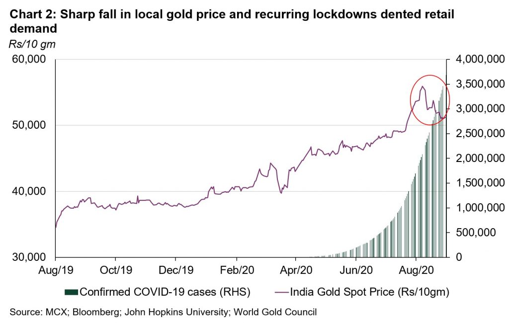 Retail demand, particularly for bars and coins, was strong until 10 August, gaining momentum as the gold price rose. Once the gold price corrected, consumers opted to wait on the side-lines to watch the future trajectory of the gold price, halting further purchases. This was exacerbated by rising COVID-19 cases in India (Chart 2). With such a weak sentiment, retailers in Kerala reported 40-50% lower y-o-y jewellery volumes sales this Onam.4