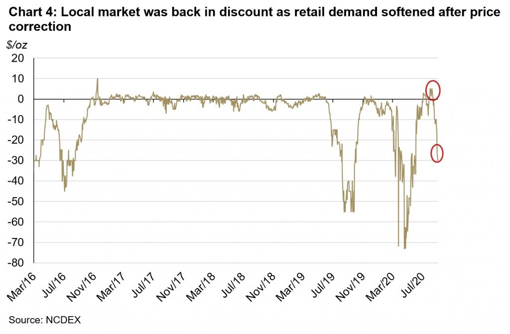Demand for gold started to improve with the onset of a rising gold price from 27 July. The demand momentum received support with a sharp rally in the local gold price, which rose by 6% between 27 July and 10 August. The domestic market traded at an average premium of US$3/oz during this period. Aligned with the international gold price, the domestic gold price fell by ~Rs3,000/10 gm – down 5.3% between 10 August and 12 August. With consumers postponing further purchases, the market fell back into discount. The weak retail demand continued through the entire month and discount in the local market widened to US3$30/oz by the end of August (Chart 4).