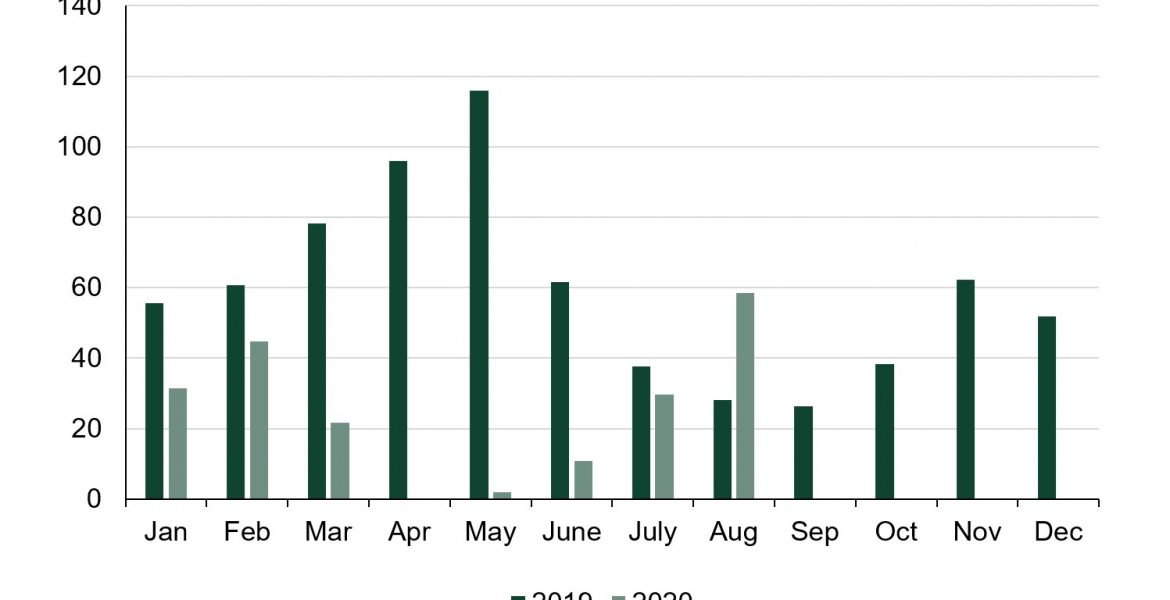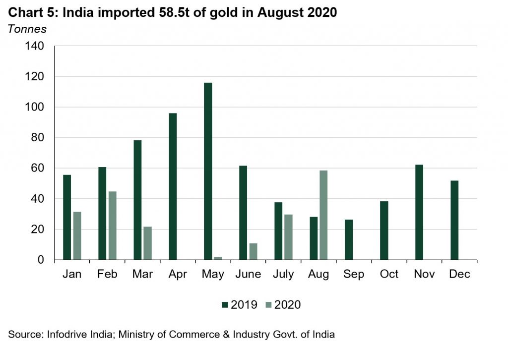 Indian official gold imports reached a nine-month high of 58.5t in August 2020 – although imports were more than double those of August 2019, y-t-d they remain very weak (-63%) (Chart 5). A total of ten banks, nominated agencies and exporters imported 48.2t of bullion during the month, and 17 refineries imported 10.3t of gold doré (fine gold content).