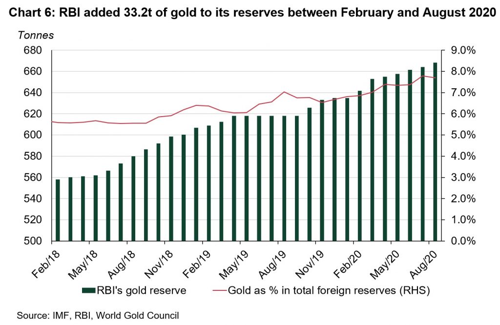 - The Reserve Bank of India (RBI) added 33.2t of gold to its reserves between February and August 2020