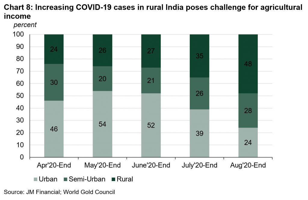 The India Meteorological Department (IMD) has forecast a normal monsoon in its second stage forecast for the southwest monsoon 2020.8 After rainfall was 9.8% lower than the Long period Average (LPA) in July, the monsoon gained strength in August and reached a 44-year high in terms of monthly departure from LPA, with rainfall 27% higher than the LPA in the month. Cumulative rainfall in the months of June to August ended at 9.8% higher than LPA at end of August. Kharif crop sowing at end of the month remained healthy (+7.2% y-o-y), which should help boost agricultural incomes (Chart 7).9Rapid spread of COVID-19 in rural India, however, poses a risk to those incomes (Chart 8).