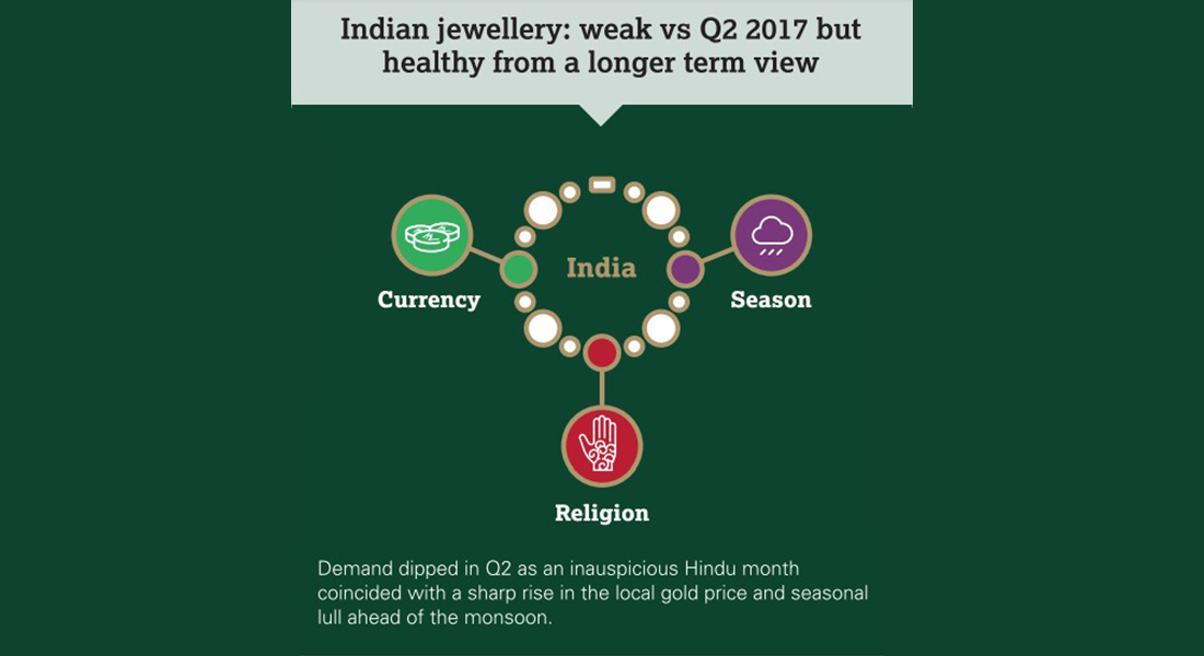 The imminent monsoon kept demand subdued towards the end of the quarter. Although the inauspicious Adhik Maas period ended on June 13th, it was rapidly followed by the onset of monsoon preparations among rural communities, aided by government attempts to boost farm incomes (such as loan waivers and raising Minimum Support Prices on certain crops). Farming communities were heavily involved in sowing crops ready for the monsoon – often a time during which gold is used as collateral for loans to buy seed rather than to purchase gold jewellery.