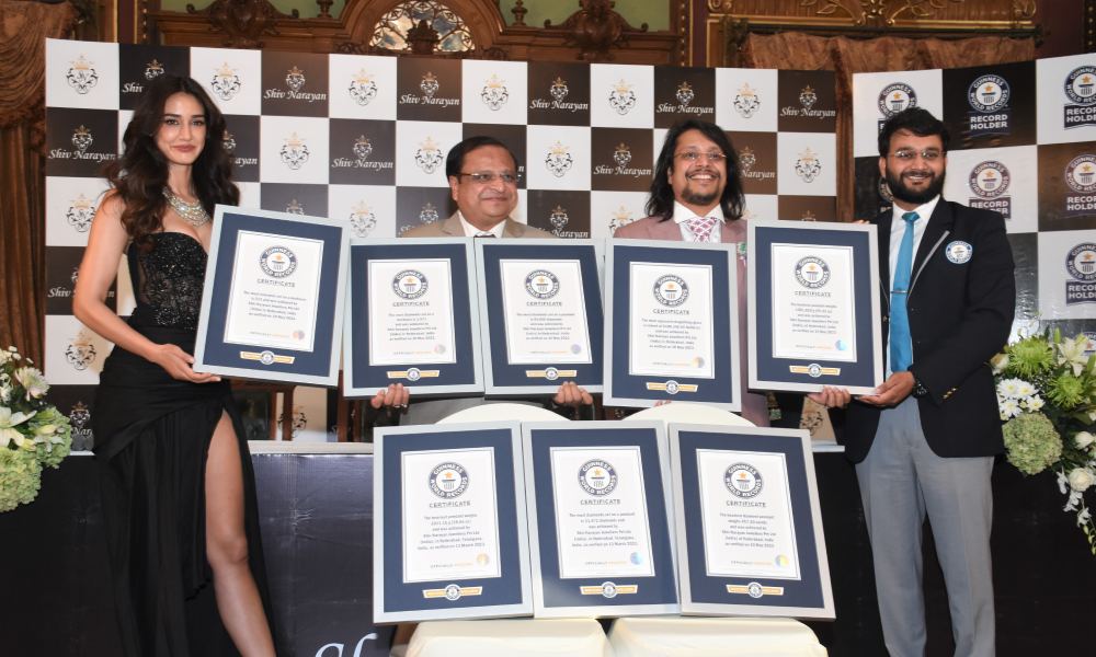 Shiv Narayan Jewellers Pvt Ltd, a renowned legacy jewellery brand based in Hyderabad, has made history by achieving eight Guinness World Records® titles, becoming the first Indian jeweller to accomplish the remarkable feat. To mark this momentous occasion, a grand celebration took place at the majestic Taj Falaknuma Palace in Hyderabad, attended by esteemed dignitaries and celebrities, paying tribute to Shiv Narayan’s rich legacy.