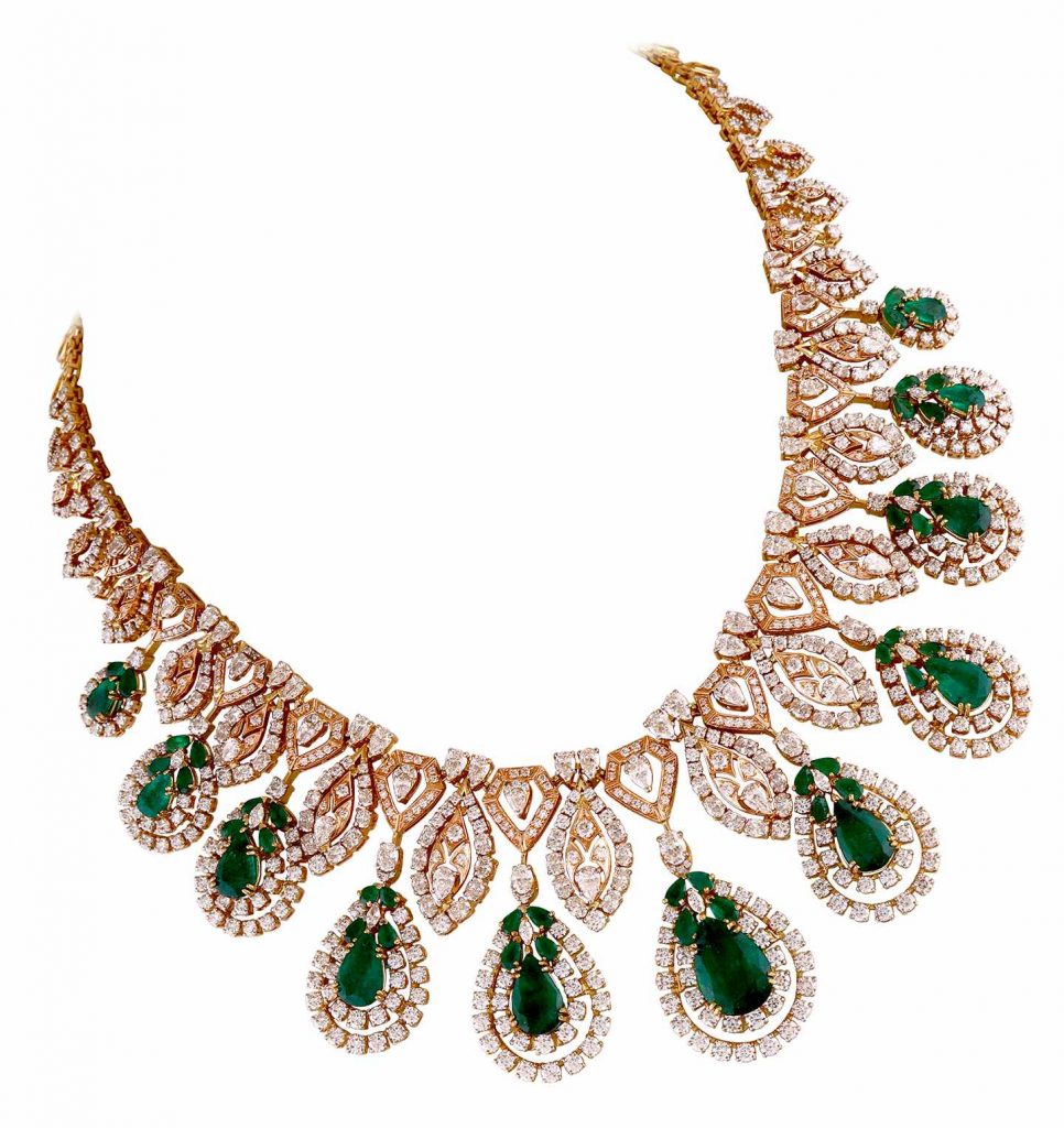 The openwork gold necklace populated with tiny diamond florets is decorated with an oval emerald and diamond stylised flower head as the central motif. By Kirtilals