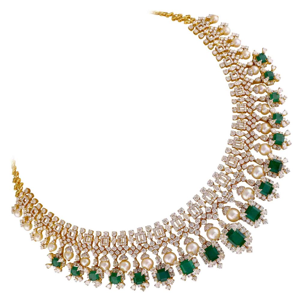 Pearls, diamonds and emeralds grace this bridal gold necklace. By Kirtilals