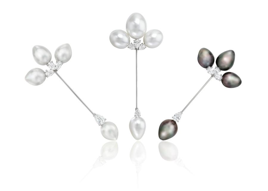 From left: The Jabot platinum pin with four drop South Sea cultured pearls & diamonds; The Jabot platinum pin with four oval pearls and diamonds; the Jabot pin crafted in platinum is adorned with four Tahitian natural colour cultured drop pearls & diamonds. By Assael