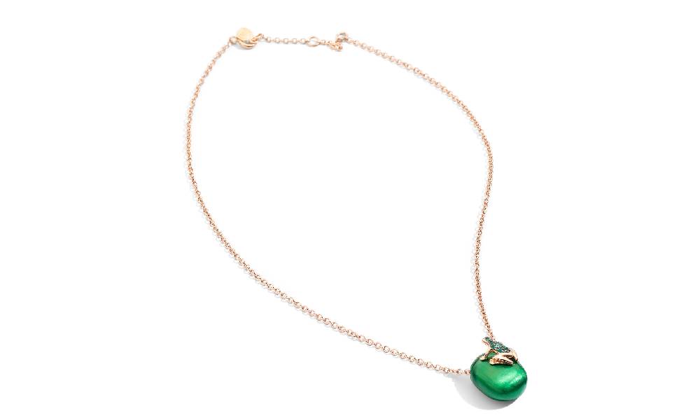 The 18-karat rose gold necklace features the frog, studded with emeralds, ready to take off from its metallic green 925 silver base, achieved through cataphoresis. By Dada Arrigoni