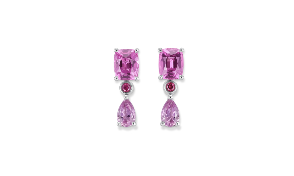 These two pink spinels from Tanzania are perfectly paired, each weighing exactly 1.10 carats. Two iconic cabochon-cut Gübelin rubies from Greenland glisten at the centre of the jewellery piece. Two pear-shaped lilac sapphires complete the multi-faceted arrangement of colours and shapes.